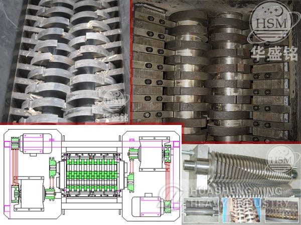 Applicable materials:Shredding plastic, rubber, fiber, paper, wood, car tyre, TV, large hollow materials, such as plastic buckets and some other large vessel, all kinds of combined waste materials, especially those with metals, or worn cutting tools.