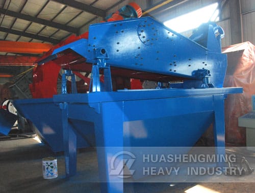 The compound of sand and water is transported to the cyclone by pump, and the fine sand after centrifugal classification concentration is provided to the vibrating screen by the grit setting mouth, after vibrating screen dewater, the fine sand and water are effectively separated. Through the recycling box, little fine sand and mud return again to the rinse tank, and then they are exhausted from the discharge hole when the rinse tank liquid level is too high. The material weight concentration recovered by the linear vibrating screen is 70%-85%. Adjusting the fineness module can be realized by changing the pump rotating speed and pulp concentration, regulating the overflow water yield and replacing the grit mouth, thus achieves its three functions—washing, dewater and classification.