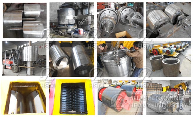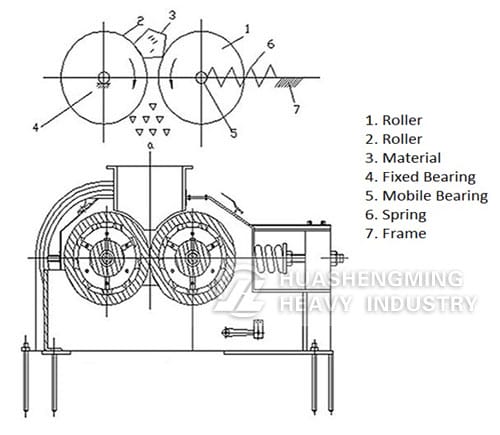 2. The material get into the crusher from the above of two rollers and are took into by extruded rollers. The desired products are discharged by 50-300Mpa effect.