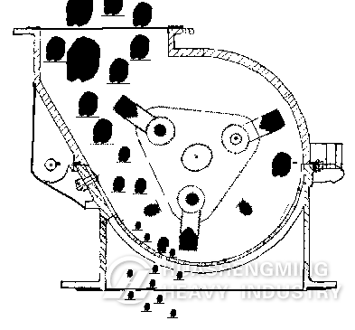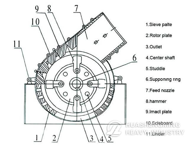 The main working part of hammer crusher is the rotor with hammers. The rotor consists of main shaft, disk, hinge pin and hammers, a sieve plate is below the rotor. The motor drives the rotor to rotate at a high speed. When the materials get into the crushing cavity, they are crushed by the rotating hammers, the crushed products which meet the required size can be discharged from the sieve plate and become the final products, the products with larger size are brought back to the crushed area for being re-crushed until they reach the required size.