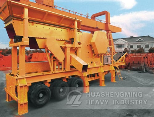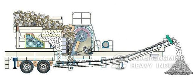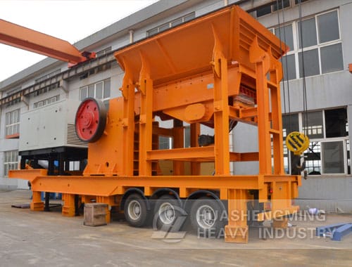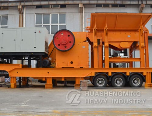 All parts of the mobile jaw crushing plant are fully vehicle-mounted including: solid frame, jaw crusher, feeder, vibrating screen, belt conveyor, motors and control boxes etc.