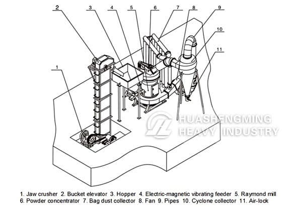 Raymond mill is a traditional mill type, which is to grind non-flammable and non-explosive materials in the fields of building materials, mining, metallurgy and chemical industry with hardness less than 7 in Moh’s scale and humidity less than 6 percent, such as: limestone, calcite, barite, dolomite, marble, talcum, gypsum, kaoline, iron ore, glass, fireproof materials, heat preservation materials, chemical materials and so on( about 300 kinds of material). The granularity of the end products can be adjusted from 30 to 325 meshes.