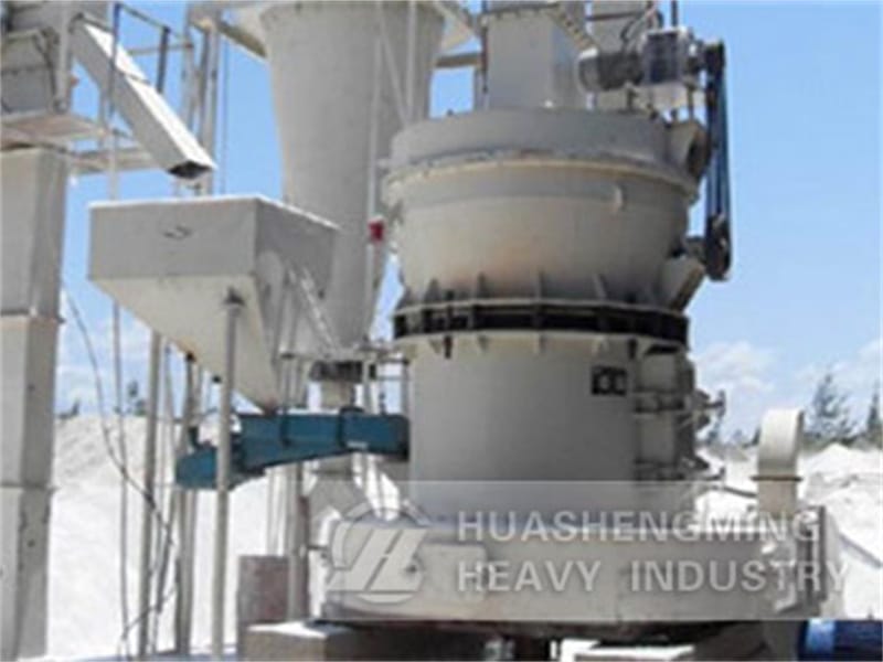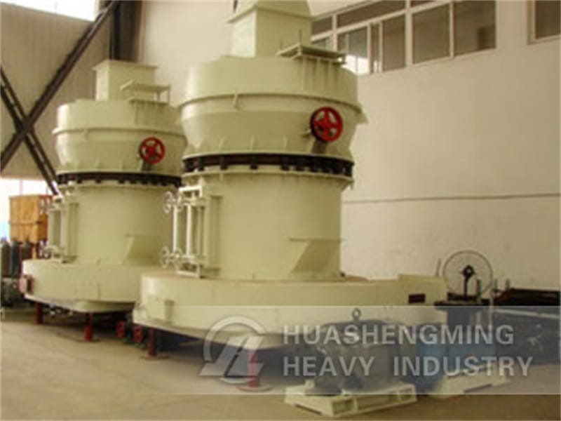 Large materials are crushed by Jaw crusher to the needed sizes firstly, then the materials are elevated to storage hopper by bucket elevator, third, the materials are fed into the grinding chamber for grinding by vibrating feeder equably and continuously. The powder after grinding goes upwards together with the airflow, after separating by powder separator, those which can meet the fineness requirement enters into the cyclone powder collector through pipe together with the airflow, and then discharged from the discharge valve as final products. The airflow is sucked into centrifugal blower through wind recycling pipe at the upper part of cyclone powder collector. The mainframe is driven by the speed reducer through the central axis in the mill. The quincunx stand connected with the upper part of central axis, at the quincunx stand, rollers are set and by which the vibrating pivot formed. Below the quincunx stand and rollers there is shovel system. Materials are fed into the space between rollers and shovels when they are turning, and then be grinded by the pressure produced when rollers are turning, thus powder is made.