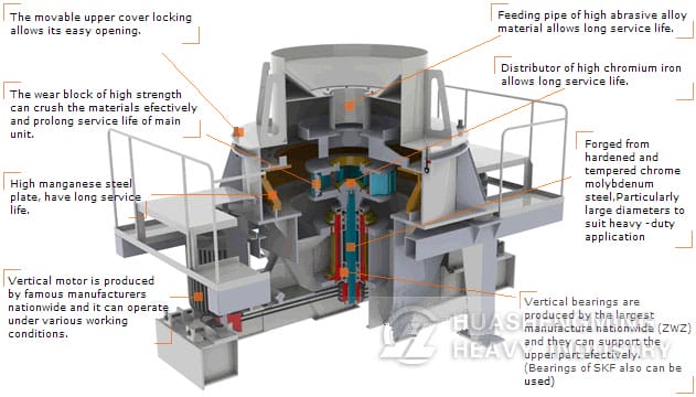 The materials fall into impeller with high-speed rotation vertically. On the force of high-speed centrifugal, the materials strike to the other part of material in a high speed. After mutual impacting, the materials will strike and rub between the impeller and the casing and then be discharged straight from the lower portion to form a closed multiple cycles. Final product is controlled by screening equipment to meet the requirement.